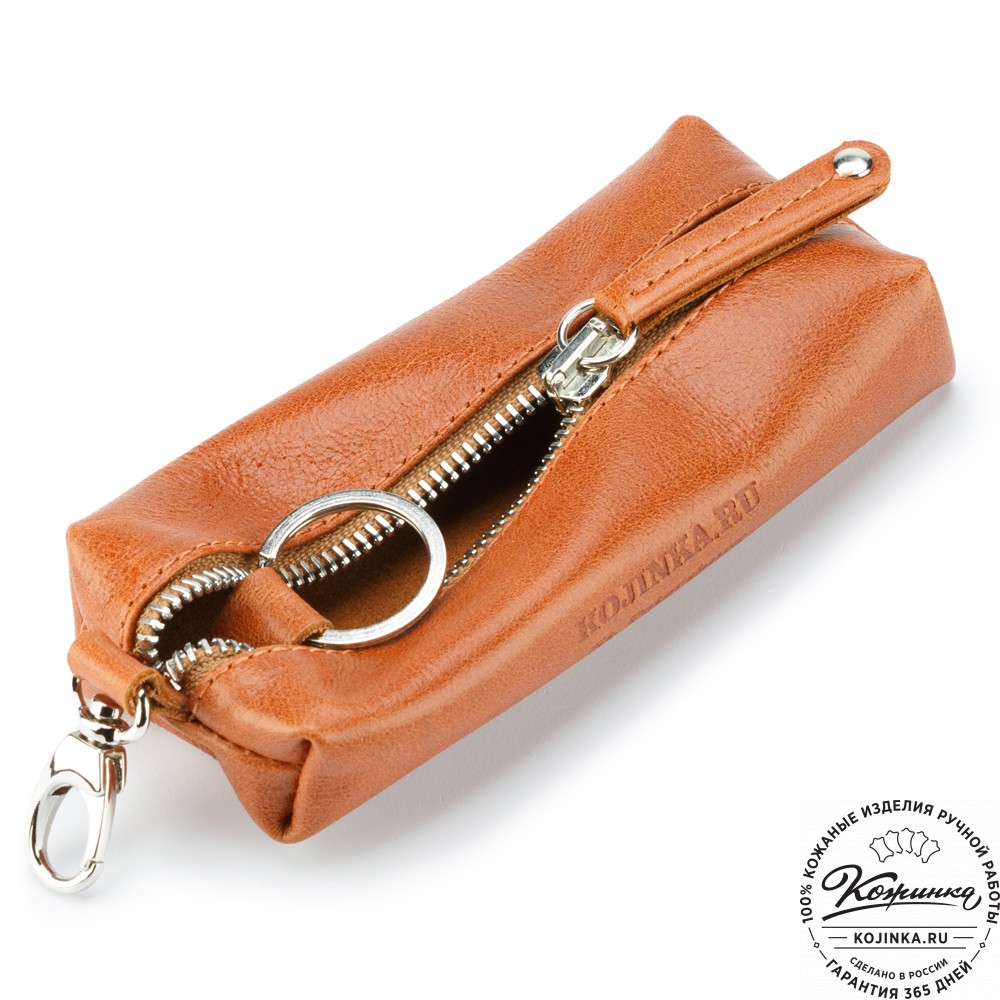Ключница на молнии, внутри кольцо для ключей, снаружи небольшой карабин. У молнии длинный удобный пуллер из кожи.