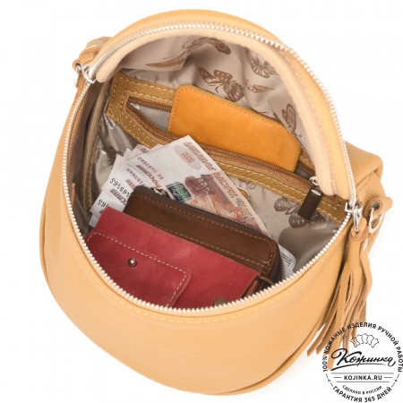 Имеет одно отделение с двумя карманами внутри. Один карман закрывается на молнию, второй открытый. Подкладка выполнена из прочной ткани с красивым узором.