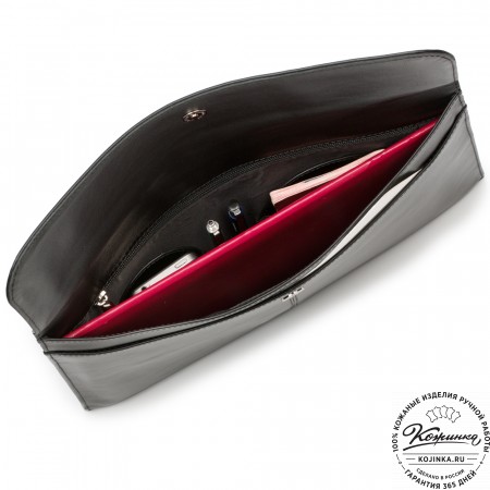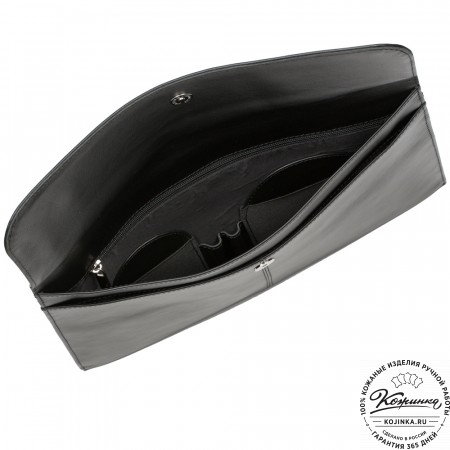 На лицевой стороне основного отделения, под клапаном, открытый карман на всю ширину папки.