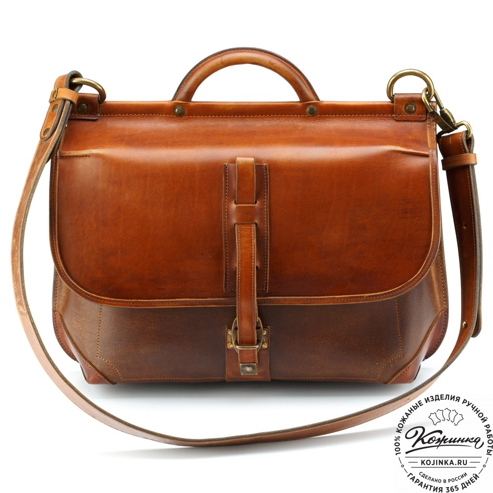 У портфеля удобная кожаная ручка и прочный плечевой ремень из толстой кожи. Ремень съемный, крепится на карабины, регулируется по длине.