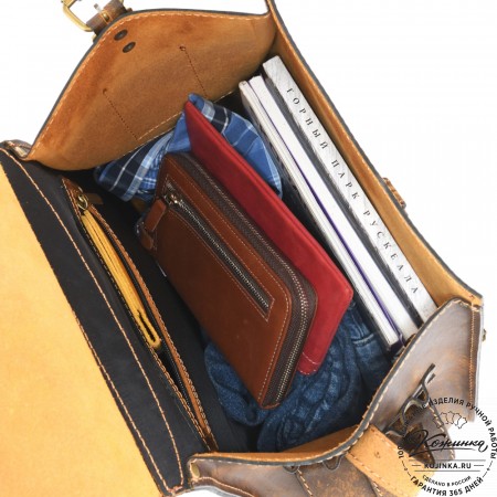 Внутри одно вместительное отделение, открывается клапаном сверху. Объёмный накладной карман ниже клапана на классических замках. Под основным клапаном карман на липучках. Два боковых кармана по бокам рюкзака. Удобные кожаные ремни - стяжки по бокам (можно использовать для ношения или крепления чего-либо).