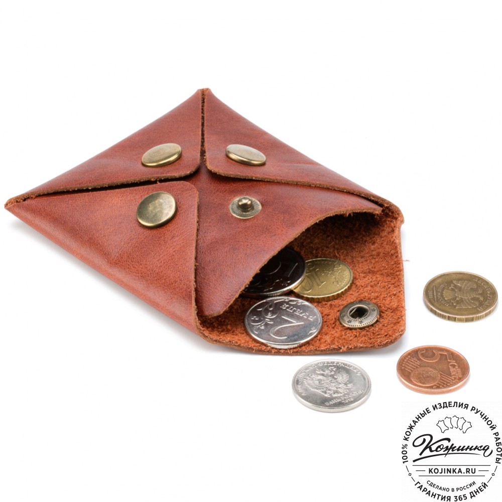 Монетница изготовлена из прочной натуральной кожи. Закрывается на кнопку.